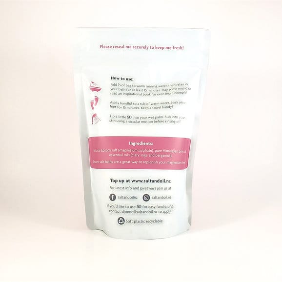 Ingredients – Natural Epsom Salt, Pure Himalayan Pink Salt, essential oils: Clary Sage* and Bergamot.